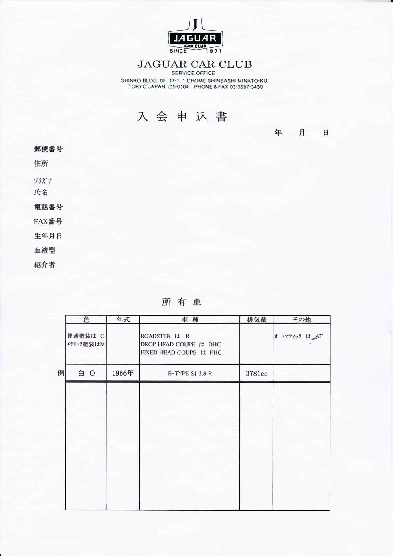 入会希望者は ジャガークラブ会則 をお読みの上、入会希望メールに・お名前・性別・生年月日・郵便番号・住所・電話番号をお書きの上、メール送信してください。